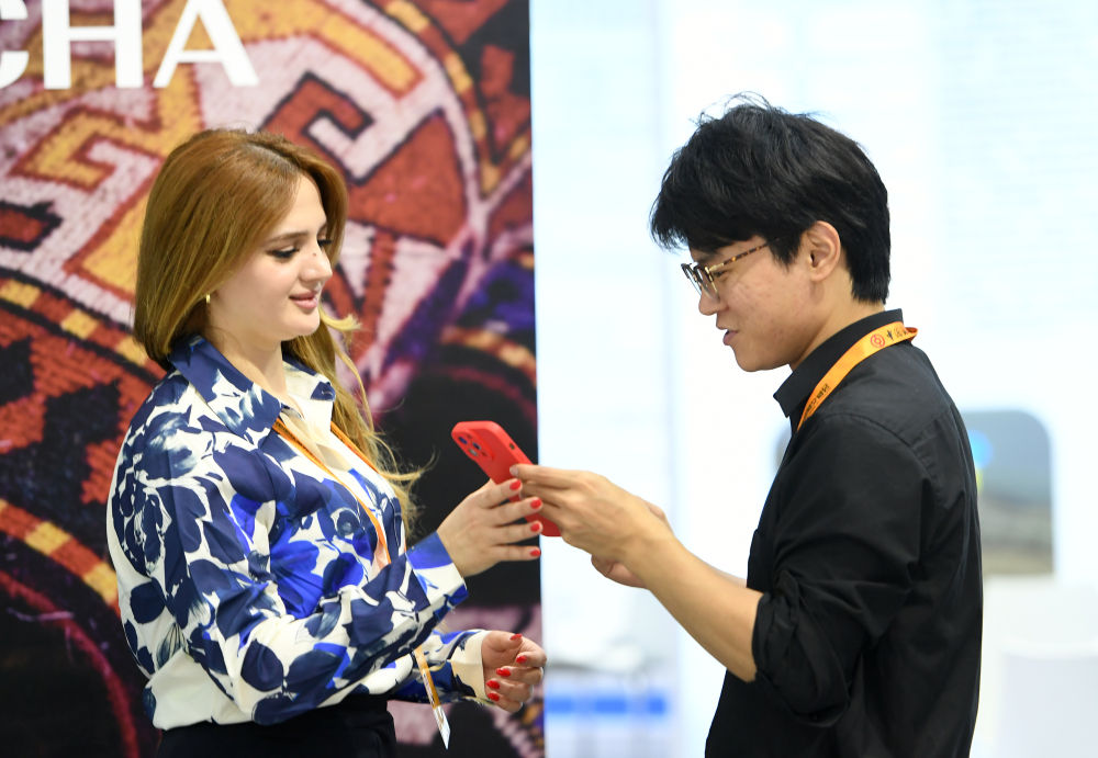 9月15日,在服貿會國家會議中心展區(qū),阿塞拜疆展臺的參展商(左)與一名中方工作人員交流。新華社記者 逯陽 攝