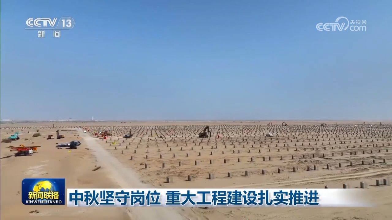 這個(gè)中秋假期,在塔克拉瑪干沙漠腹地,上千名施工人員沒有休息,加快建設(shè)萬畝光伏治沙項(xiàng)目,他們將用光伏板鋪滿3285個(gè)足球場大小的沙丘,年底建成后,將為周邊化工產(chǎn)業(yè)群提供每年21億度的清潔電能。