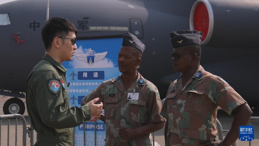 9月18日,中國空軍運(yùn)-20機(jī)組成員在南非首都比勒陀利亞的非洲航空航天與防務(wù)展上向外國友人進(jìn)行介紹。新華社發(fā)(王銳杰攝)