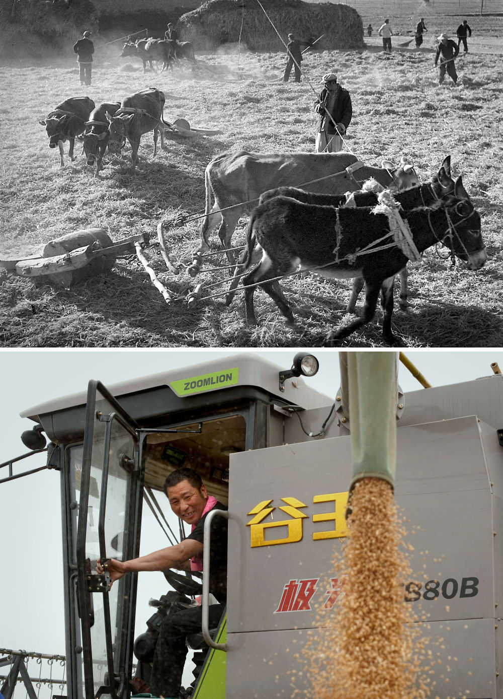 拼版照片:上圖為1965年,河南林縣(現(xiàn)林州市)上陶大隊(duì)第四生產(chǎn)隊(duì)的社員在碾麥打場(chǎng)(新華社記者 楊丙文 攝);下圖為2020年5月29日,在河南商水南陵村的一處麥田里,一位“麥客”將收割脫粒后的小麥直接裝車(chē)(新華社記者 李安 攝)。