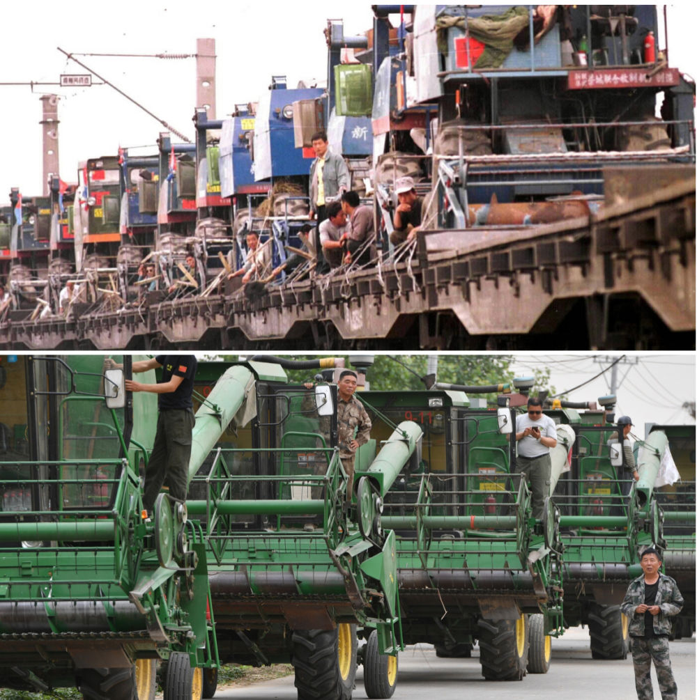 拼版照片:上圖為1999年,滿(mǎn)載著參加跨區(qū)收割小麥作業(yè)收割機(jī)的專(zhuān)列從石家莊鐵路分局正定火車(chē)站開(kāi)出,將河北深州、藁城等地農(nóng)民的120多臺(tái)收割機(jī)運(yùn)往河南開(kāi)封(新華社記者 周文廣 攝);下圖為2020年6月2日,在河南周口黃泛區(qū)農(nóng)場(chǎng)九分場(chǎng),農(nóng)機(jī)隊(duì)伍準(zhǔn)備出發(fā)(新華社記者 李嘉南 攝)。