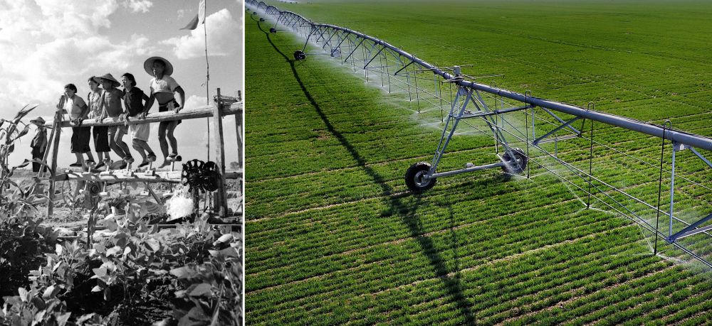 拼版照片:左圖為20世紀(jì)50年代,河南郾城萬(wàn)金公社社員在踩水車(chē)澆田(魏德忠 攝);右圖為2017年3月9日,在河南??h王莊鎮(zhèn)一處麥田里,自走式智能?chē)姽鄼C(jī)在進(jìn)行噴灌作業(yè)(新華社記者 李安 攝)。