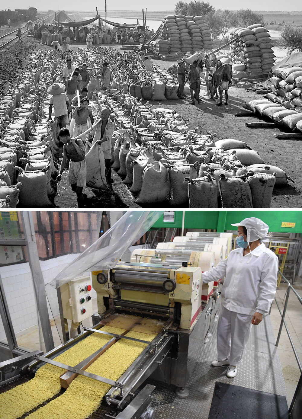 拼版照片:上圖為1963年,河南郾城裴城車(chē)站糧食收購(gòu)站,堆放著大批農(nóng)民交售的原糧(新華社記者 楊丙文 攝);下圖為2018年11月27日,在河南臨潁一家方便面生產(chǎn)企業(yè),工作人員在車(chē)間流水線上作業(yè)(新華社記者 李安 攝)。