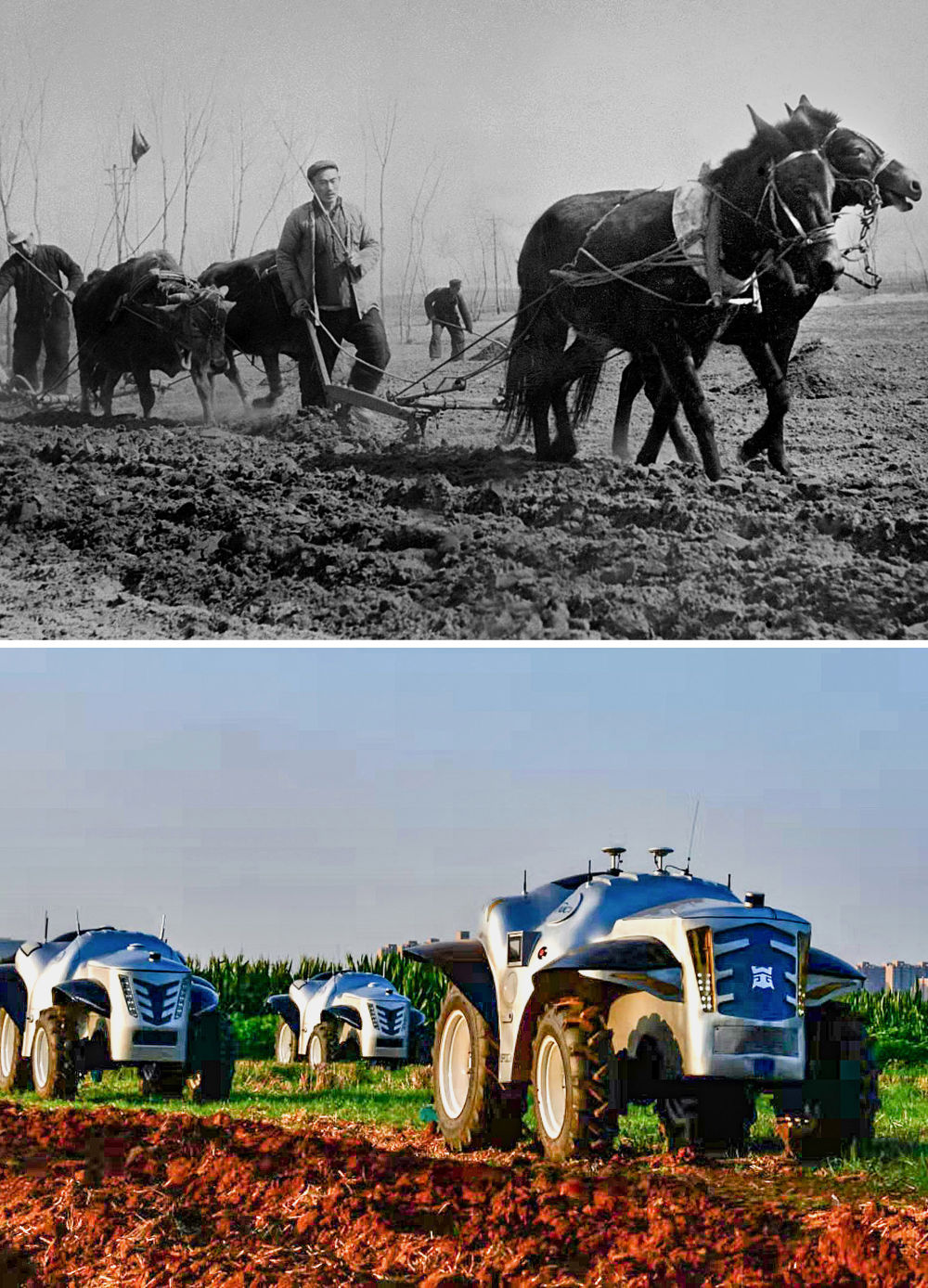 拼版照片:上圖為1954年,河南開(kāi)封農(nóng)民在用傳統(tǒng)的畜拉步犁耕地(呂學(xué)召 攝);下圖為2019年7月26日,洛陽(yáng)一拖集團(tuán)生產(chǎn)的純電動(dòng)無(wú)人駕駛拖拉機(jī)準(zhǔn)備做耕地測(cè)試(潘郁 攝)。