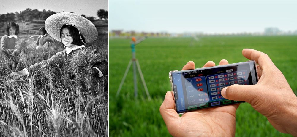 拼版照片:左圖為1961年,河南新縣陡山河鄉(xiāng)的技術(shù)員在進(jìn)行田間調(diào)查,確定小麥選種地塊(新華社記者 張青云 攝);右圖為2021年4月14日,在河南商水一處高標(biāo)準(zhǔn)農(nóng)田里,種糧大戶(hù)邱守先使用手機(jī)操控設(shè)備對(duì)小麥田進(jìn)行自動(dòng)噴灌(新華社記者 李安 攝)。