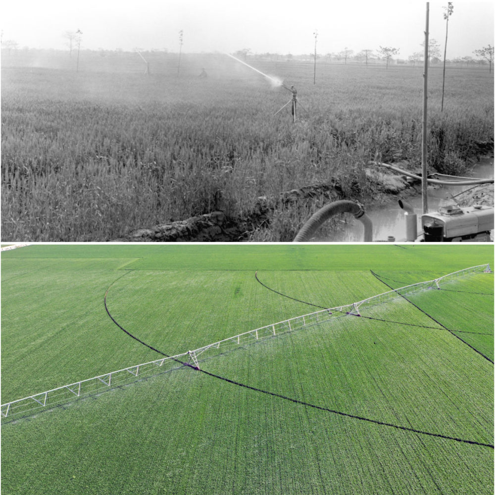 拼版照片:上圖為1981年,河南蘭考爪營(yíng)公社爪營(yíng)三大隊(duì)購(gòu)買(mǎi)了12部噴灌機(jī),在抗災(zāi)中發(fā)揮了巨大作用,小麥獲得豐收(新華社記者 朱廣智 攝);下圖為2020年4月24日,在河南省??h30萬(wàn)畝高標(biāo)準(zhǔn)糧田示范區(qū)內(nèi),大型噴灌機(jī)在進(jìn)行噴灌作業(yè)攝(新華社記者 李嘉南 攝)。