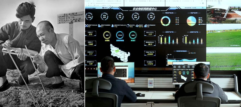 拼版照片:左圖為20世紀(jì)50年代,河南滎陽(yáng)廣武農(nóng)業(yè)社社員在測(cè)量、記錄地溫(謝延華 攝);右圖為2021年4月14日,工作人員在河南商水農(nóng)業(yè)物聯(lián)網(wǎng)控制中心內(nèi)工作(新華社記者 李安 攝)。