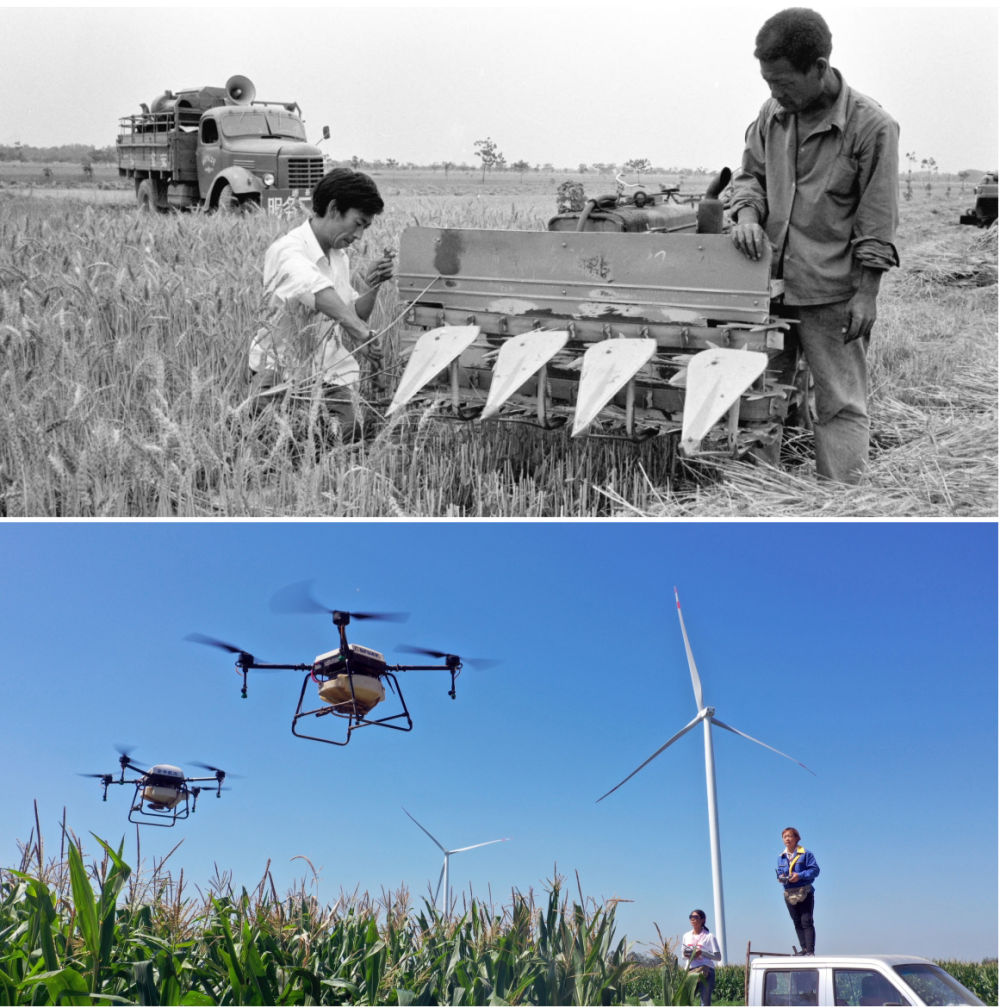 拼版照片:上圖為1986年,河南浚縣農(nóng)機(jī)公司組織服務(wù)隊(duì)走村串鄉(xiāng)義務(wù)修理農(nóng)業(yè)機(jī)械(新華社記者 唐茂林 攝);下圖為2020年9月4日,河南湯陰“精忠飛防大隊(duì)”飛手在操作植保無(wú)人機(jī)(新華社記者 李嘉南 攝)。
