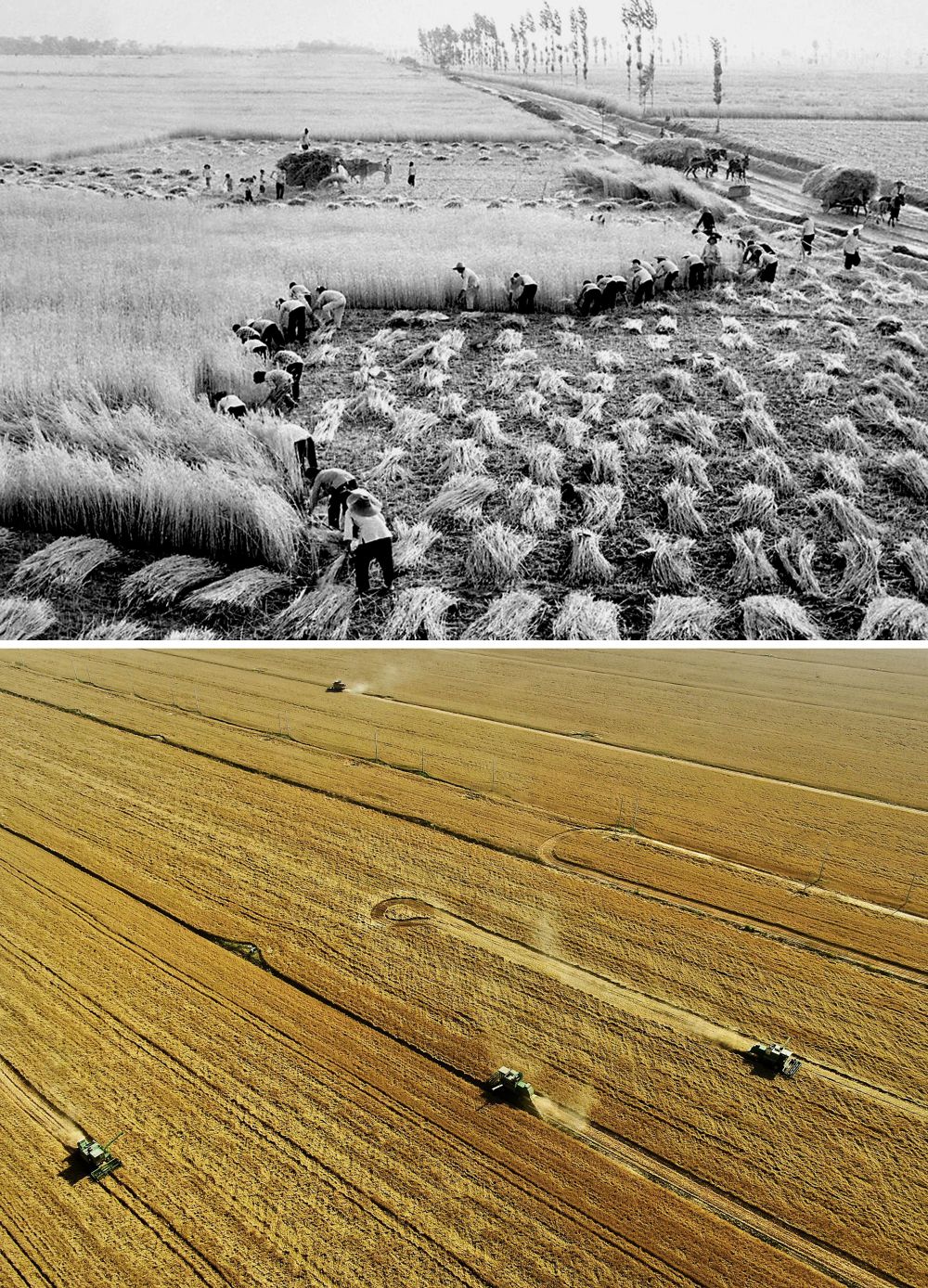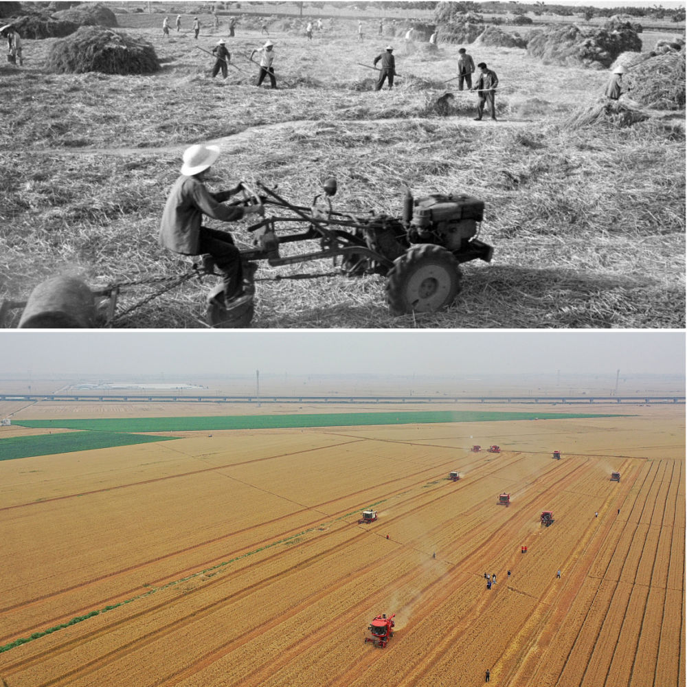拼版照片:上圖為20世紀(jì)50年代,河南偃師萬(wàn)畝豐產(chǎn)區(qū)開(kāi)鐮收割小麥(新華社記者 唐茂林 攝);下圖為2021年6月6日,在河南周口黃泛區(qū)農(nóng)場(chǎng)九分場(chǎng)的麥田里,農(nóng)機(jī)手操作收割機(jī)收獲小麥(新華社記者 李安 攝)。