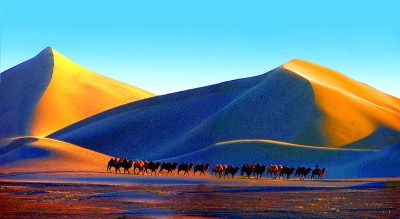 在巴丹吉林沙漠中行進的駝隊。趙興忠攝