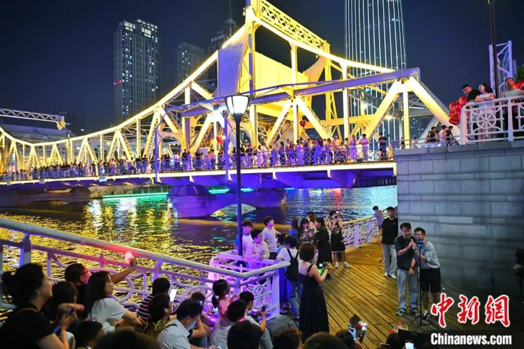 6月8日晚,在天津解放橋下的親水平臺(tái),市民及游客近距離聆聽“野生歌手”的歌聲。中新社記者 佟郁 攝