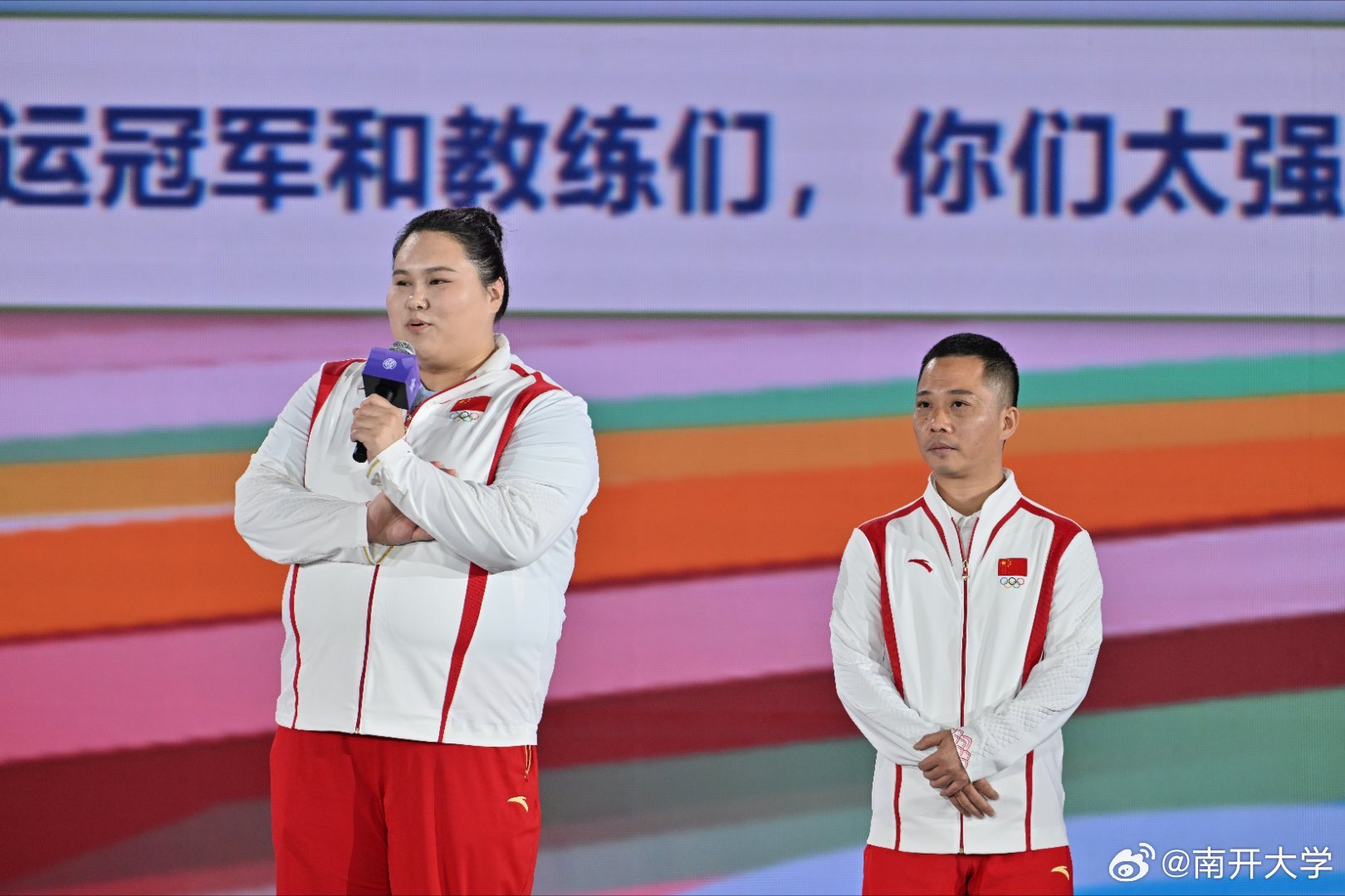 舉重運(yùn)動(dòng)員李雯雯和她的教練吳美錦。@南開大學(xué) 圖