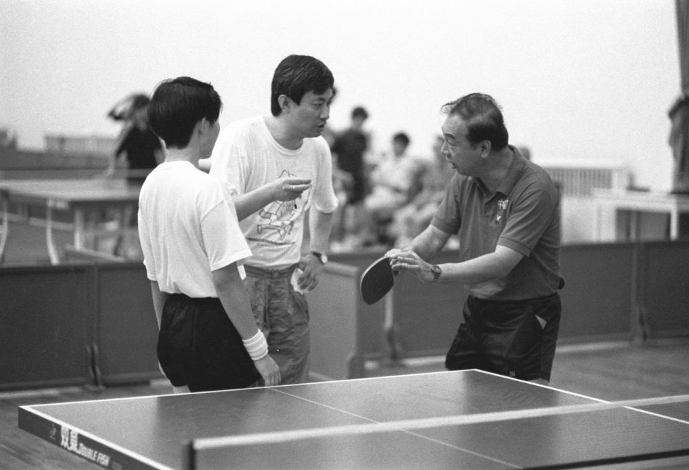 這是張燮林(右)在第35屆世界乒乓球錦標賽女子雙打比賽中指導葛新愛、閻桂麗(資料照片)。新華社記者 胡偉 攝