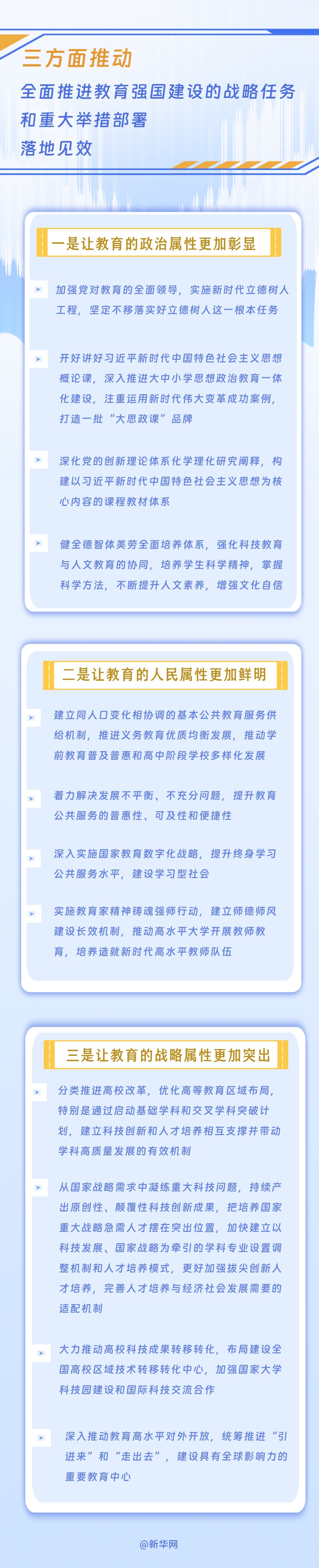 懷進(jìn)鵬介紹,將重點(diǎn)從讓教育的政治屬性更加彰顯、讓教育的人民屬性更加鮮明、讓教育的戰(zhàn)略屬性更加突出三個(gè)方面推進(jìn)。