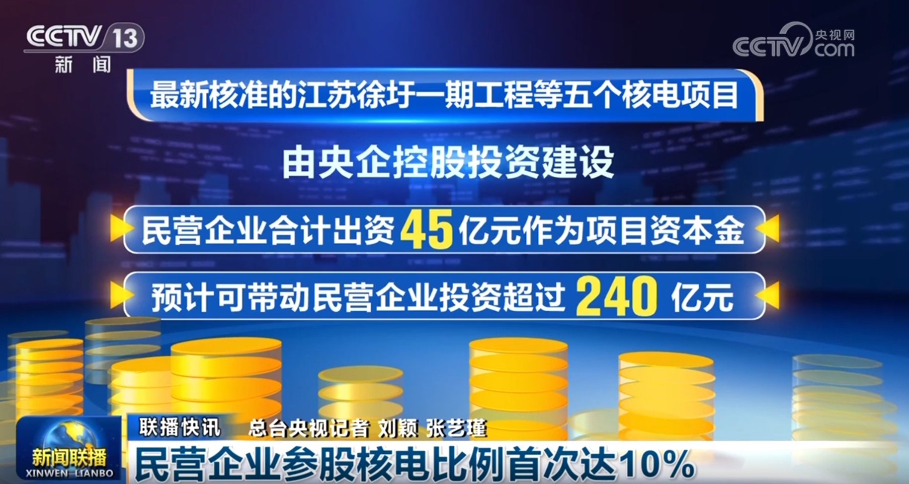 記者從國家發(fā)展改革委了解到,近期國務(wù)院核準(zhǔn)的江蘇徐圩一期工程等五個核電項目,由央企控股投資建設(shè),民營企業(yè)合計出資45億元作為項目資本金,預(yù)計可帶動民營企業(yè)投資超過240億元。民營企業(yè)參股核電的比例首次提高到了10%,核電領(lǐng)域進(jìn)一步向民資放開。
