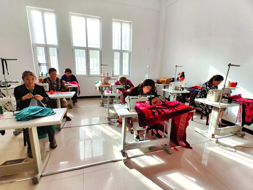 托云牧場積極鞏固政策支持,集中力量打造項目驅(qū)動,有效推進(jìn)地方產(chǎn)業(yè)集群的全面發(fā)展,實現(xiàn)經(jīng)營集約化與產(chǎn)業(yè)高效整合。2015年,由牧場“刺繡巧匠”吐孔·沙熱牽頭并成功注冊了“托云牧場帕米爾刺繡”合作社。到了2019年,牧場成功申請到160萬元援疆資金,用于建設(shè)新的手工刺繡產(chǎn)品生產(chǎn)基地。在吐孔·沙熱的帶動下,合作社目前擁有60名成員,其中43名技藝嫻熟的繡工,年總收入攀升至三十萬。該合作社通過直銷、與克州百來思服裝店的業(yè)務(wù)合作,以及接受附近學(xué)校的校服訂單等多種渠道,將其生產(chǎn)的床品、家居布藝、女性服裝及校服推向阿圖什市、烏恰縣等地區(qū)市場。