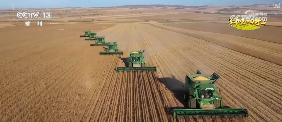 在呼倫貝爾甘河農(nóng)牧場(chǎng)的大豆田里,6臺(tái)大型收割機(jī)在金色的田野里繁忙作業(yè),這里地勢(shì)開(kāi)闊,每臺(tái)收割機(jī)每天可收割1000畝大豆。