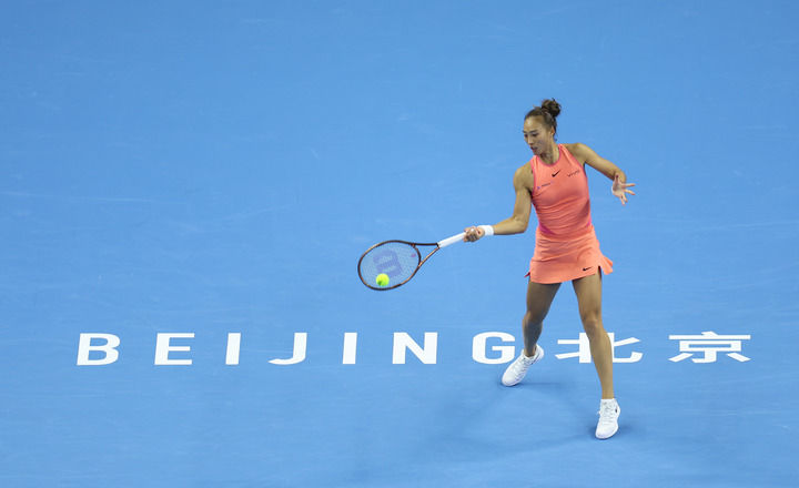 10月2日,鄭欽文在比賽中回球。當(dāng)日,在北京進(jìn)行的2024中國(guó)網(wǎng)球公開賽女子單打第四輪比賽中,中國(guó)選手鄭欽文2比1戰(zhàn)勝美國(guó)選手阿尼西莫娃,晉級(jí)八強(qiáng)。新華社發(fā)(杜昕怡攝)