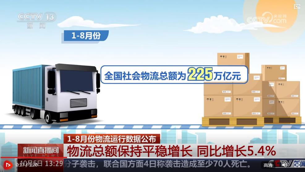 央視網(wǎng)消息:中國物流與采購聯(lián)合會10月5日公布今年1至8月份物流運(yùn)行數(shù)據(jù)。數(shù)據(jù)顯示,8月份社會物流運(yùn)行總體穩(wěn)定,社會物流總額累計保持5%以上的穩(wěn)定增長。