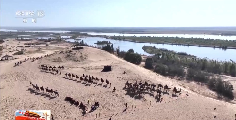 總臺(tái)記者 朱達(dá):寧夏銀川市黃沙古渡景區(qū)以一處千年古渡命名,匯集了黃河、沙漠、湖泊、濕地和田園等多種自然風(fēng)光。十一期間全國(guó)各地的游客來(lái)到黃沙古渡, 一方面可以欣賞大漠風(fēng)光、感受黃河文化 ,另一方面可以體驗(yàn)騎駱駝、沙漠沖浪和飛索等多種項(xiàng)目。