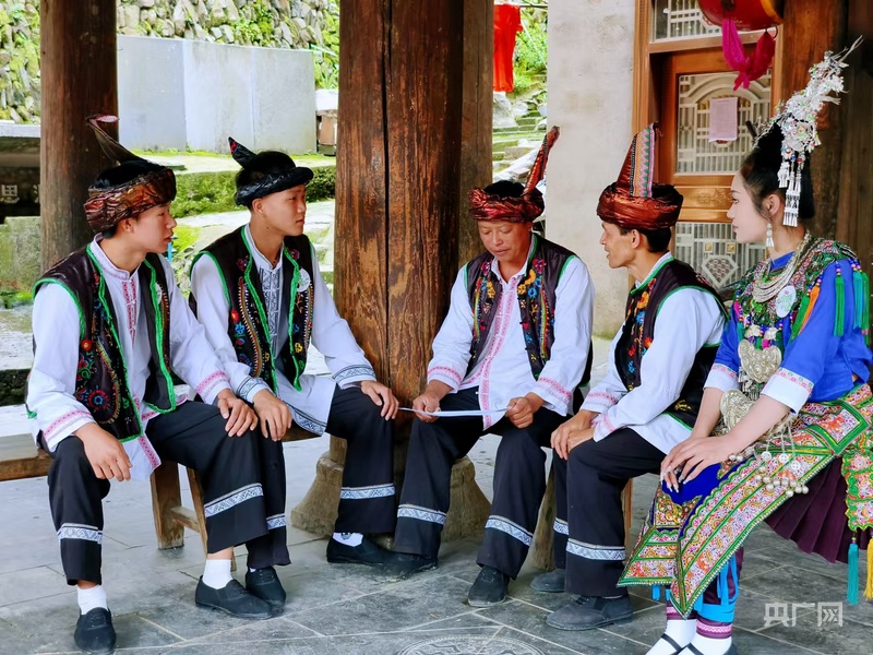 聶和香(右一)在鼓樓與村民共商侗寨文旅傳承(央廣網(wǎng)記者 欒小琳 攝)