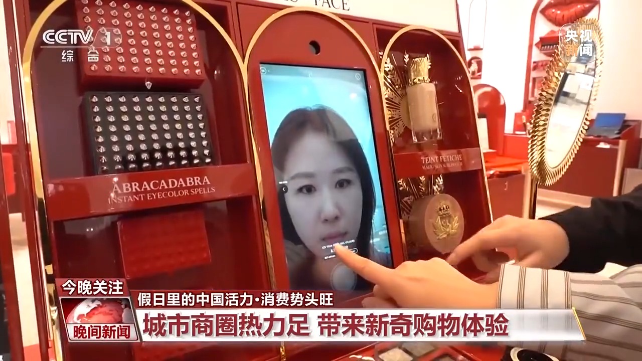 在四川成都,一家大型商場的裸眼3D大屏換上了國慶新裝,身臨其境的原始森林、被滿天繁星包裹,吸引了許多游客前來打卡。現(xiàn)場更有虛擬試妝、虛擬試鞋、智能導(dǎo)購等等前沿科技帶來的新奇購物體驗。