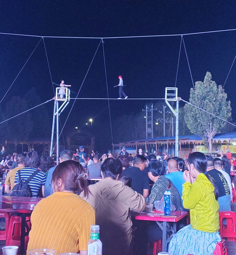 夜幕降臨,華燈初上,阿克蘇老街夜市美食與文化的融合相得益彰。特色烤包子、烤全羊、抓飯、肚包肉等美食的香氣與攤主的叫賣(mài)聲交織在一起;民族樂(lè)器、木盤(pán)、木碗、木勺等非遺產(chǎn)品,既有滄桑感,更有文化味;達(dá)瓦孜表演中,兩名演員在手持平衡桿,在高空繩索上表演前后走動(dòng)、盤(pán)腿端坐、蒙眼行走、飛身跳躍等一系列驚心動(dòng)魄的技藝,引得觀眾拍手稱(chēng)絕;賽乃姆、龜茲樂(lè)舞等讓人們感受到了中華文化的魅力和深厚底蘊(yùn)。