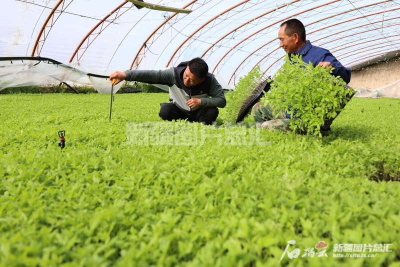 2023年4月17日,新疆生產(chǎn)建設(shè)兵團(tuán)第五師86團(tuán)一家種植專業(yè)合作社大棚育苗基地里,農(nóng)技人員指導(dǎo)社員管護(hù)蔬菜苗。呂羨林?jǐn)z