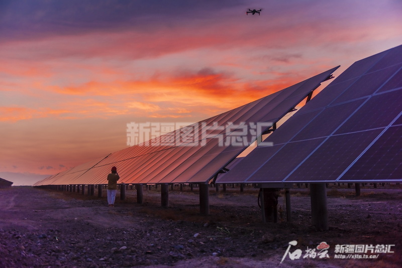 2024年8月20日,新疆生產(chǎn)建設(shè)兵團(tuán)第七師124團(tuán)10萬千瓦光伏發(fā)電項(xiàng)目建設(shè)現(xiàn)場,工人在檢查光伏板。田國建攝