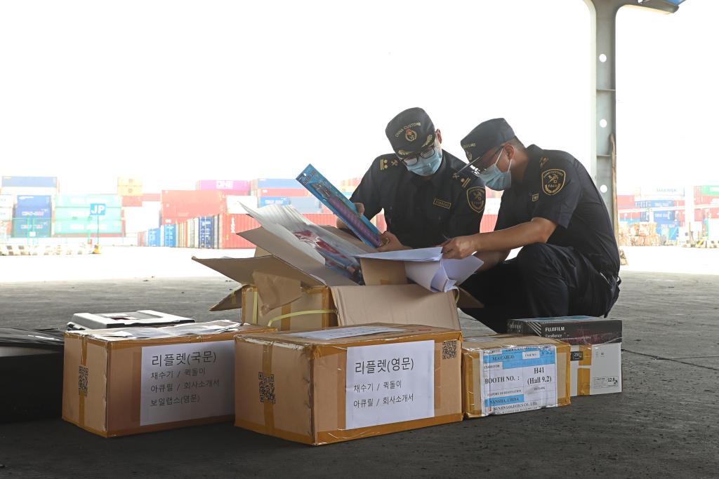 廣州海關(guān)所屬南沙海關(guān)關(guān)員對第136屆廣交會進口展品進行監(jiān)管。(麥東豪攝)