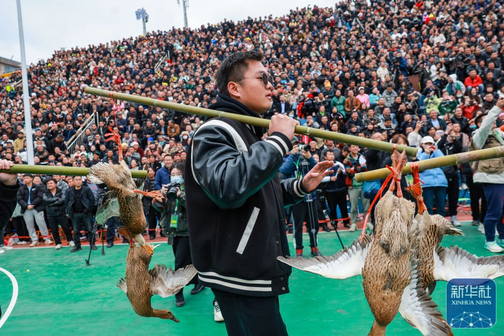 2023年3月27日,村民挑著當(dāng)?shù)剞r(nóng)特產(chǎn)品“三穗麻鴨”進(jìn)入賽場(chǎng)。這是季軍銅仁市代表隊(duì)的獎(jiǎng)品。 當(dāng)日,貴州省首屆“美麗鄉(xiāng)村”籃球聯(lián)賽總決賽在黔東南州臺(tái)江縣臺(tái)盤(pán)村舉行。新華社記者 歐東衢 攝