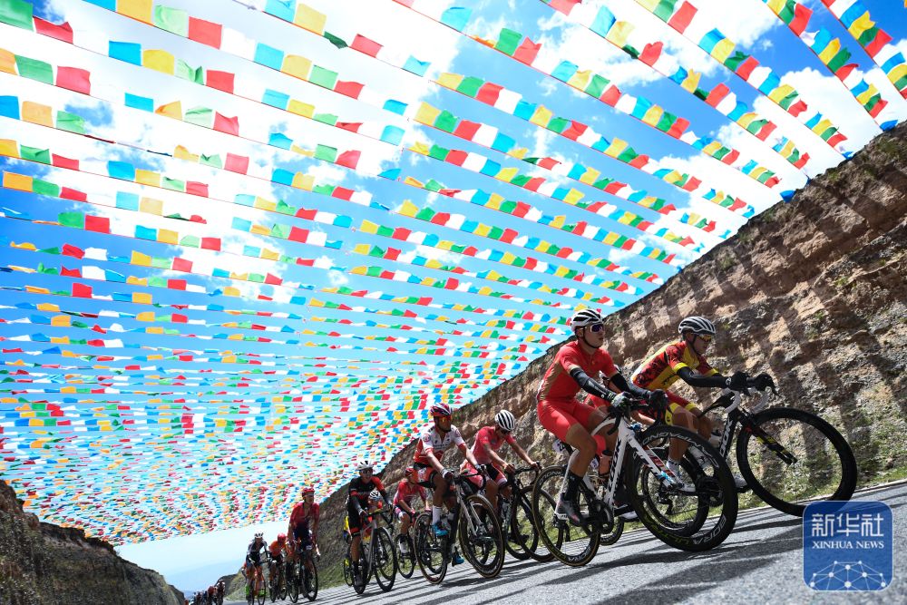 2022年7月29日,參賽選手在比賽中騎行。 當(dāng)日,第二十一屆環(huán)青海湖國(guó)際公路自行車(chē)賽進(jìn)行了第三賽段貴德至共和的角逐。 新華社記者 張龍 攝