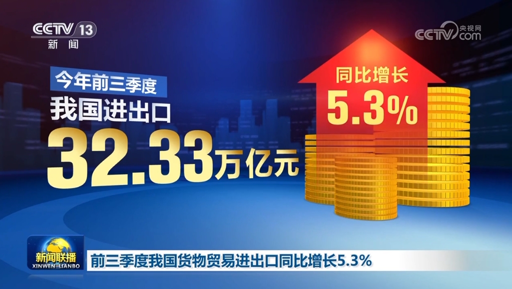 據海關統(tǒng)計,今年前三季度,我國進出口32.33萬億元,同比增長5.3%。其中出口18.62萬億元,增長6.2%;進口13.71萬億元,增長4.1%。