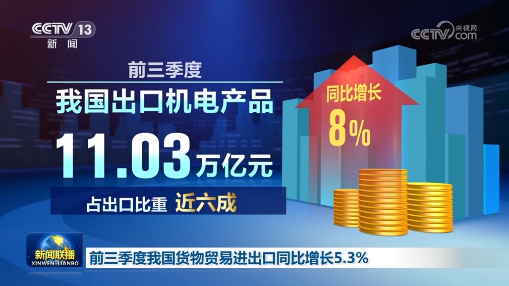 從國內看,出口產品結構持續(xù)優(yōu)化。前三季度,我國出口機電產品11.03萬億元,同比增長8%,占出口比重近六成。
