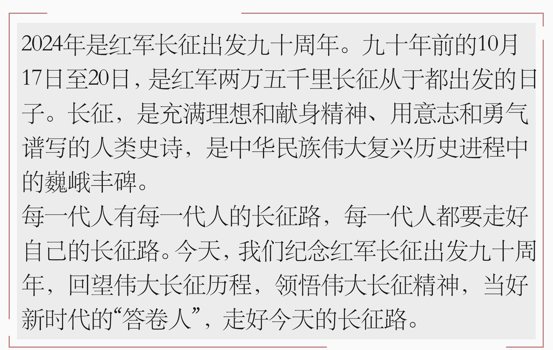 長征是一次理想信念的偉大遠征。中國共產(chǎn)黨領導紅軍,以非凡的智慧和大無畏的英雄氣概,戰(zhàn)勝千難萬險,付出巨大犧牲,勝利完成震撼世界、彪炳史冊的長征,實現(xiàn)了中國共產(chǎn)黨和中國革命事業(yè)從挫折走向勝利的偉大轉折,開啟了中國共產(chǎn)黨為實現(xiàn)民族獨立、人民解放而斗爭的新的偉大進軍。