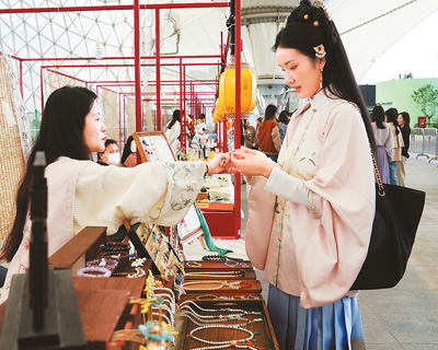 華服愛(ài)好者在二〇二四年“中國(guó)華服周·滬上繁花”國(guó)風(fēng)市集上挑選飾品。新華社記者 劉穎攝