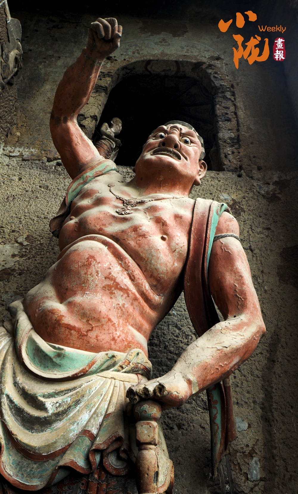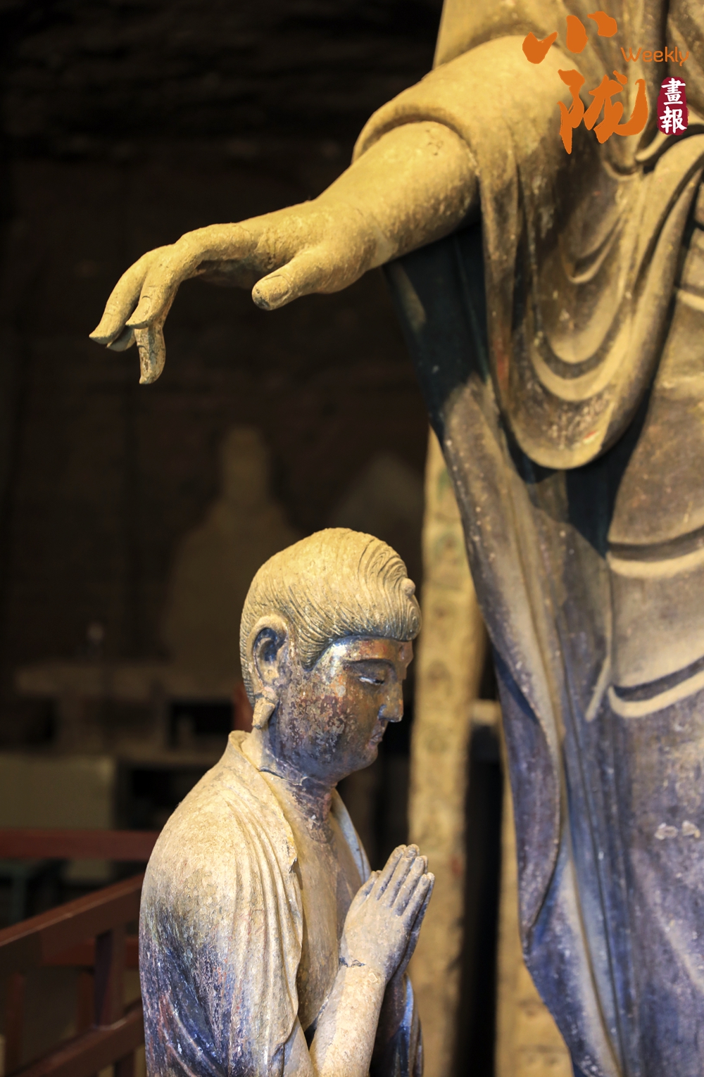 麥積山的塑像,除早期作品外,從北魏開(kāi)始,幾乎所有的佛像都是俯首下視的體態(tài),有和藹可親的面容,并且面帶微笑。雖為佛祖,卻像世俗的人,是人們美好愿望的化身。