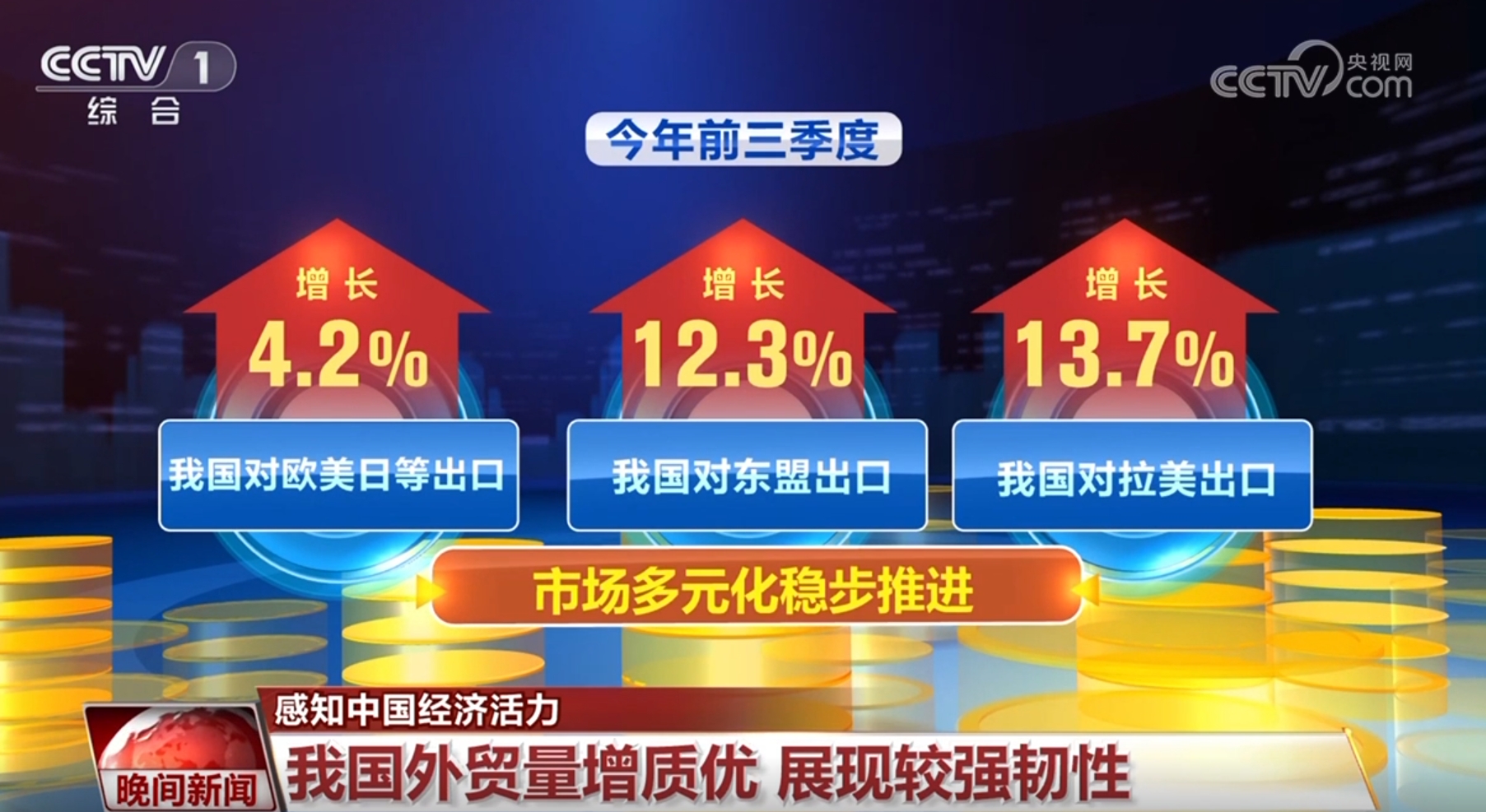 今年以來,我國(guó)外貿(mào)量增質(zhì)優(yōu),展現(xiàn)較強(qiáng)韌性。世貿(mào)組織最新數(shù)據(jù)顯示:上半年我國(guó)出口國(guó)際市場(chǎng)份額為14.3%,同比提高0.4個(gè)百分點(diǎn)。前三季度,我國(guó)與160多個(gè)國(guó)家和地區(qū)貿(mào)易實(shí)現(xiàn)增長(zhǎng),對(duì)歐美日等傳統(tǒng)市場(chǎng)出口增長(zhǎng)了4.2%,對(duì)東盟、拉美等新興市場(chǎng)出口分別增長(zhǎng)了12.3%和13.7%,市場(chǎng)多元化穩(wěn)步推進(jìn)。在深圳鹽田港,僅今年前9個(gè)月就新增了16條航線。