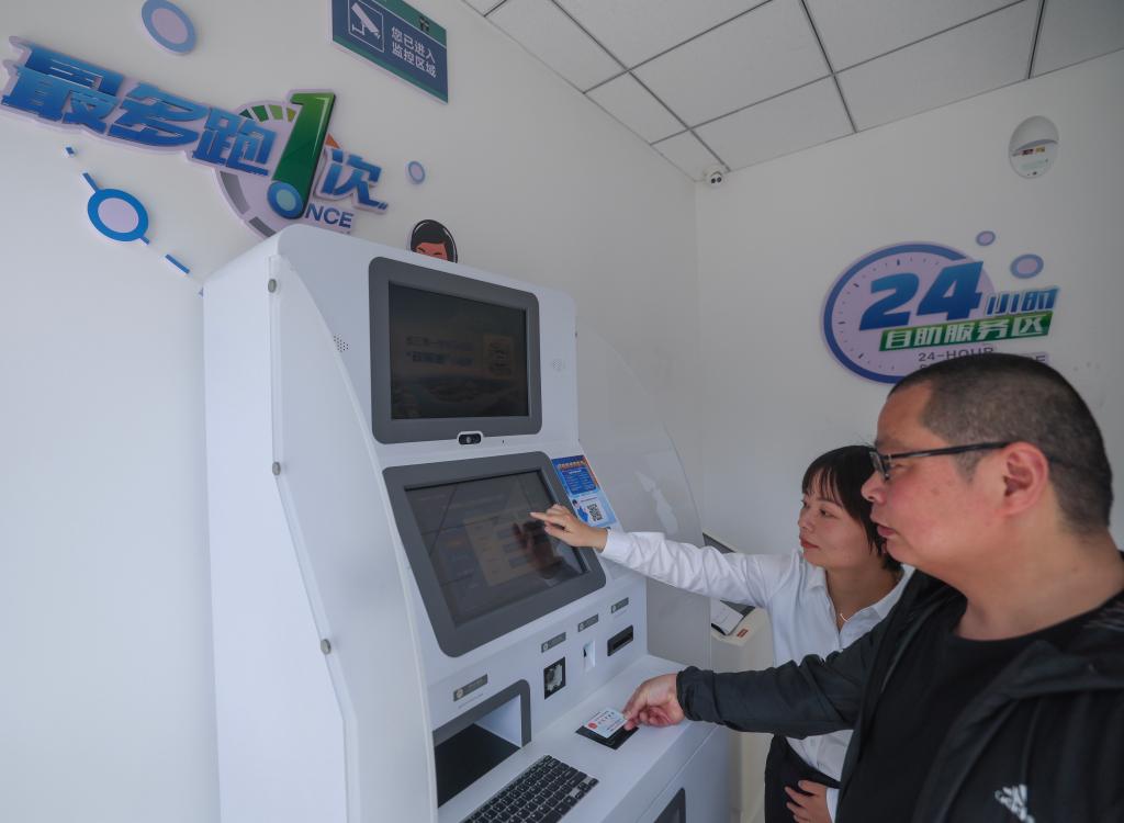2024年5月9日,在浙江省嘉興市秀洲區(qū)王江涇鎮(zhèn)便民服務(wù)中心,工作人員指導(dǎo)居民對在蘇州工作期間的社保繳費記錄進行自助跨省查詢。新華社記者 徐昱 攝
