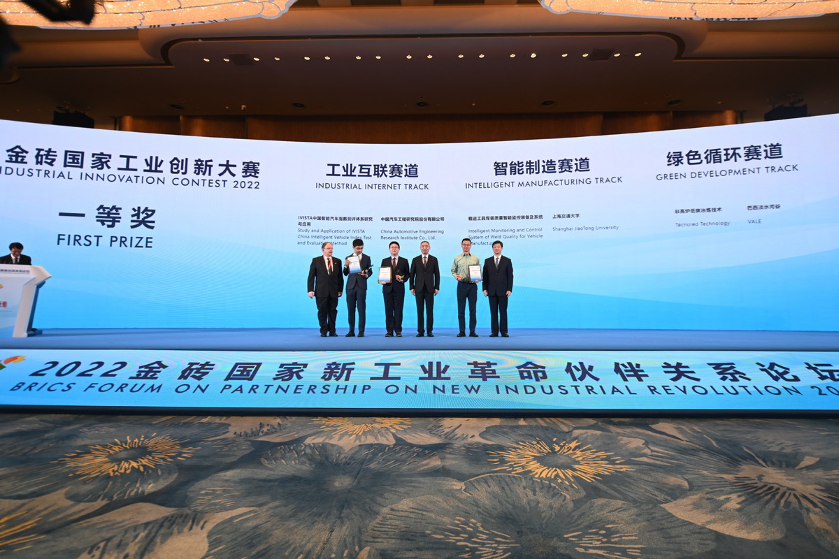 2022年9月7日,2022金磚國(guó)家工業(yè)創(chuàng)新大賽一等獎(jiǎng)獲得者和頒獎(jiǎng)嘉賓在廈門合影。(圖片來源:新華社)