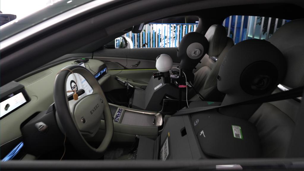 在展區(qū)中的一輛新能源汽車內(nèi)部,一臺機(jī)器人正在模擬乘客與汽車進(jìn)行語音交互,汽車外的一塊大屏幕上,實時分析顯示語音交互效果的準(zhǔn)確性、穩(wěn)定性和及時性,并最終自動生成報告。這款智能座艙人機(jī)交互效果評測機(jī)器人首次亮相,便吸睛無數(shù)。