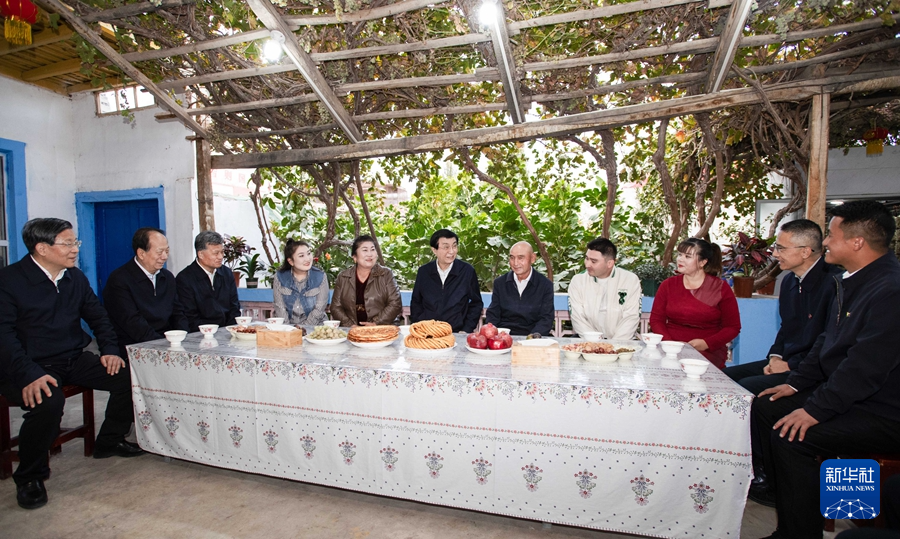 10月21日至24日,中共中央政治局常委、全國政協(xié)主席王滬寧在新疆和田、喀什調研。這是23日下午,王滬寧在疏勒縣塔孜洪鄉(xiāng)臺吐爾村同干部群眾交流。新華社記者 李濤 攝