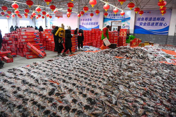 2023年12月27日,游客在查干湖漁場(chǎng)超市選購(gòu)查干湖魚。新華社記者 張楠 攝