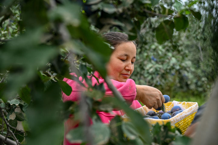 農(nóng)民在新疆昆玉市老兵鎮(zhèn)一家種植園內(nèi)采摘新西梅(9月4日攝)。新華社記者 陳朔 攝