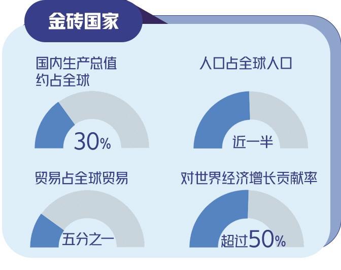 今年是“大金磚合作”開局之年。擴(kuò)員后,金磚國家國內(nèi)生產(chǎn)總值約占全球30%、人口占全球人口近一半、貿(mào)易占全球貿(mào)易五分之一,金磚成色更足、分量更重、潛能更大。
