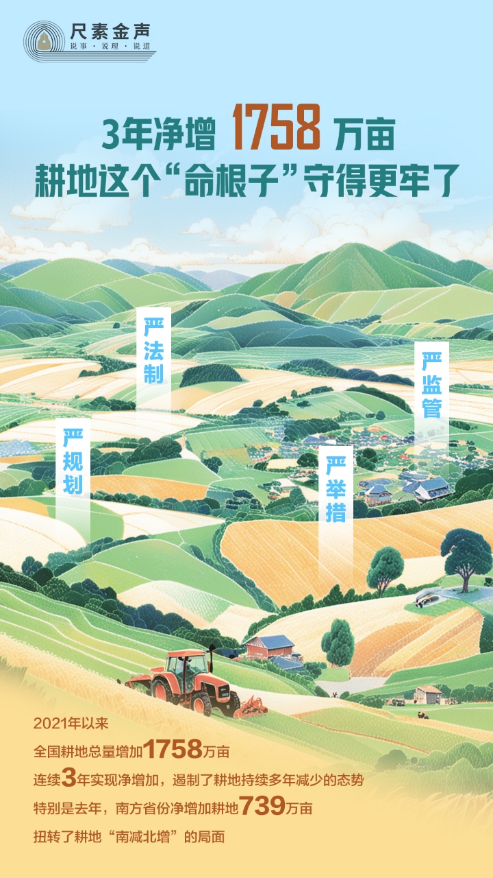 自然資源部日前發(fā)布數(shù)據(jù)顯示:2021年以來,全國耕地總量增加1758萬畝,連續(xù)3年實現(xiàn)凈增加,遏制了耕地持續(xù)多年減少的態(tài)勢。特別是去年,南方省份凈增加耕地739萬畝,扭轉(zhuǎn)了耕地“南減北增”的局面。