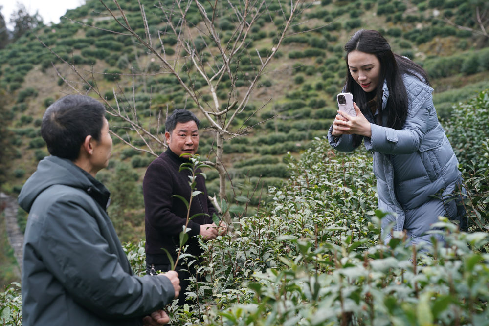 云霧環(huán)抱的山地茶園里,白墻灰瓦的民居點綴其中,三三兩兩的游人在慢行道上騎行觀光……記者來到陜西省安康市紫陽縣向陽鎮(zhèn)富硒茶觀光園時,看到在當地從事電商行業(yè)的林紅梅正帶領幾名主播在茶園中邊走邊直播。