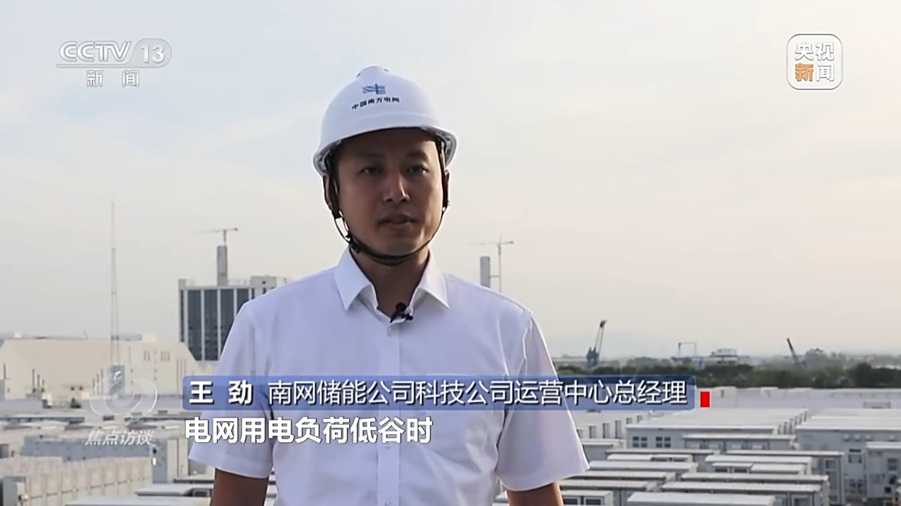 南網(wǎng)儲(chǔ)能公司科技公司運(yùn)營(yíng)中心總經(jīng)理 王勁:電網(wǎng)用電負(fù)荷低谷時(shí),把電廠發(fā)出的多余的電儲(chǔ)存到250個(gè)電池儲(chǔ)能柜內(nèi),用電高峰時(shí),把電池儲(chǔ)能柜里的電能釋放出來支持電網(wǎng)的電力供應(yīng)。