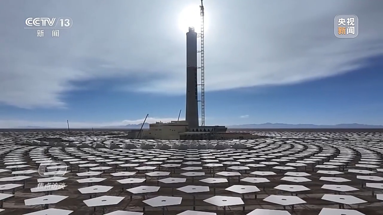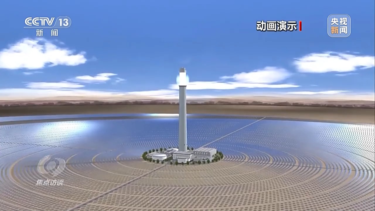 電站通過高精度智能定日鏡,實(shí)時(shí)跟蹤太陽的運(yùn)動(dòng),將太陽直接輻射光反射聚集到吸熱塔上,將吸熱塔內(nèi)的熔鹽加熱到560多℃的高溫,將高溫的熔鹽進(jìn)行儲(chǔ)存,在需要發(fā)電時(shí)再通過高溫熔鹽與水進(jìn)行熱交換,產(chǎn)生高溫高壓的蒸汽,驅(qū)動(dòng)汽輪發(fā)電機(jī)組發(fā)電。