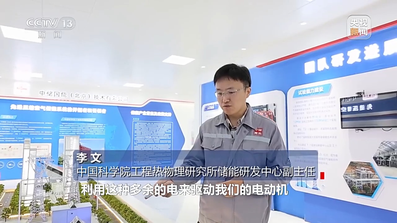 中國(guó)科學(xué)院工程熱物理研究所儲(chǔ)能研發(fā)中心副主任 李文:利用多余的電來驅(qū)動(dòng)電動(dòng)機(jī),帶動(dòng)壓縮機(jī)把空氣壓縮到高壓狀態(tài),最后存儲(chǔ)到儲(chǔ)氣裝置中,在有需要的時(shí)候,我們利用所存儲(chǔ)的高壓空氣來驅(qū)動(dòng)膨脹機(jī),帶動(dòng)發(fā)電機(jī)進(jìn)行做功發(fā)電。